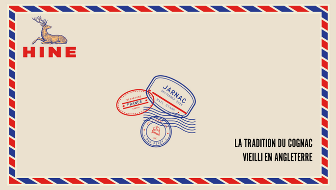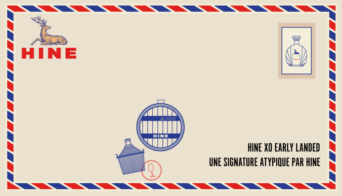 à l’horizontale — un geste discret de liberté face à la tradition. La carafe XO Hine, habituellement parée de rouge et d’or, revêt désormais les bleu, blanc et rouge des enveloppes d’airmail britanniques : un clin d’œil subtil aux liens historiques qui unissent Hine au Royaume-Uni.